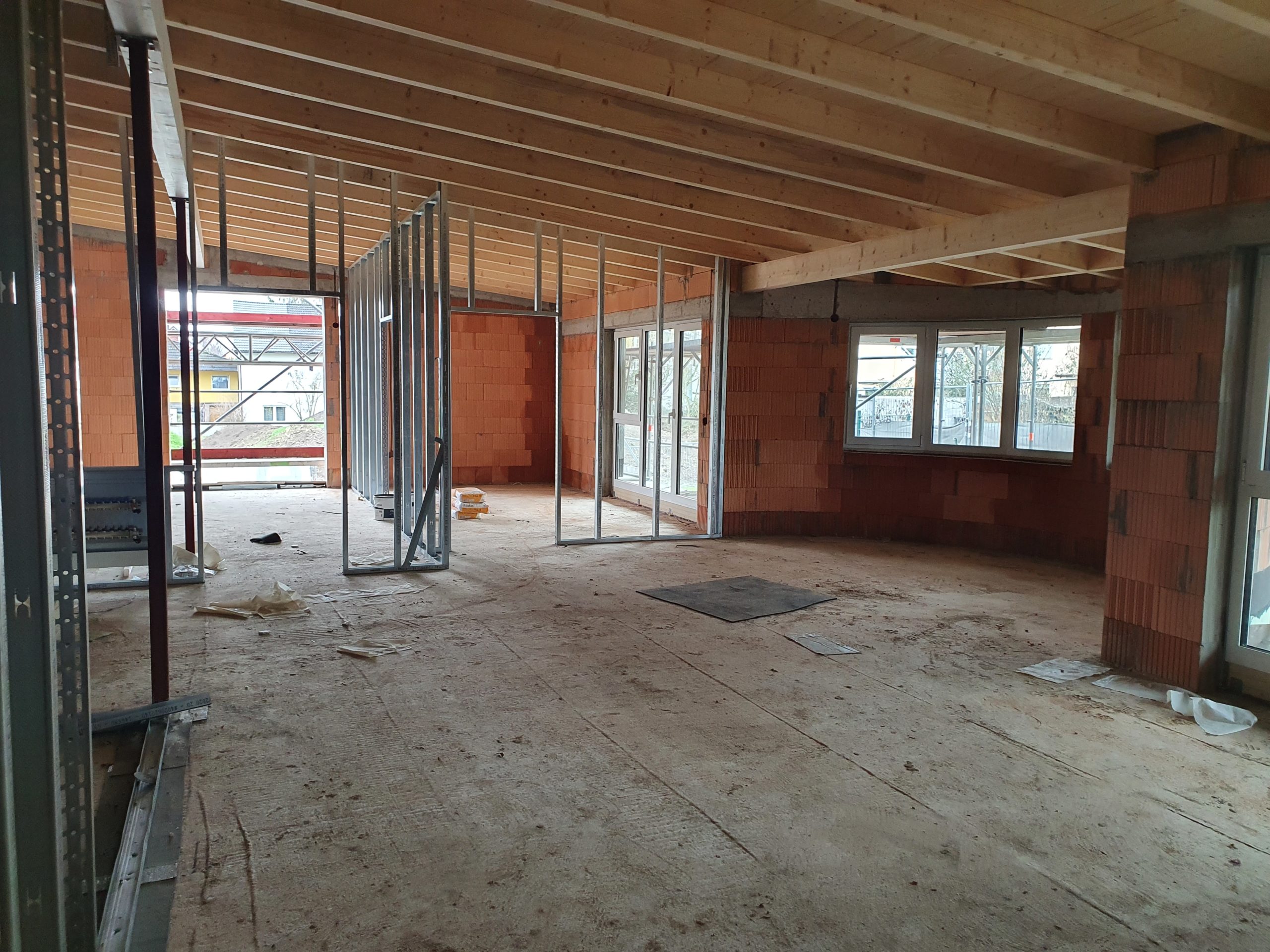 Die Trockenbauarbeiten werden wohl schon in dieser Woche abgeschlossen sein, auch im darüber liegenden Gemeinderaum für Erwachsenenbildung, Vereine und Familien.